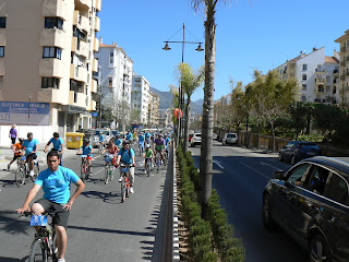 Ayer,una larguisima cola de camisetas azules.Nos paseamos por las calles de Fuengirola y Mijas.Padres y Madres,niños y niñas,jóvenes, abuelos,nativos,extranjeros,cristianos, o no,argentinos,ingleses,croatas etc.....Todos con una sola camiseta.Sin prisas,sin dejar rastro,sin contaminar,sin hacer ruido.Pero lo pasamos estupendamente.Gracias a Fuenmijasenbici.Esto se debería repetir mas a menudo.